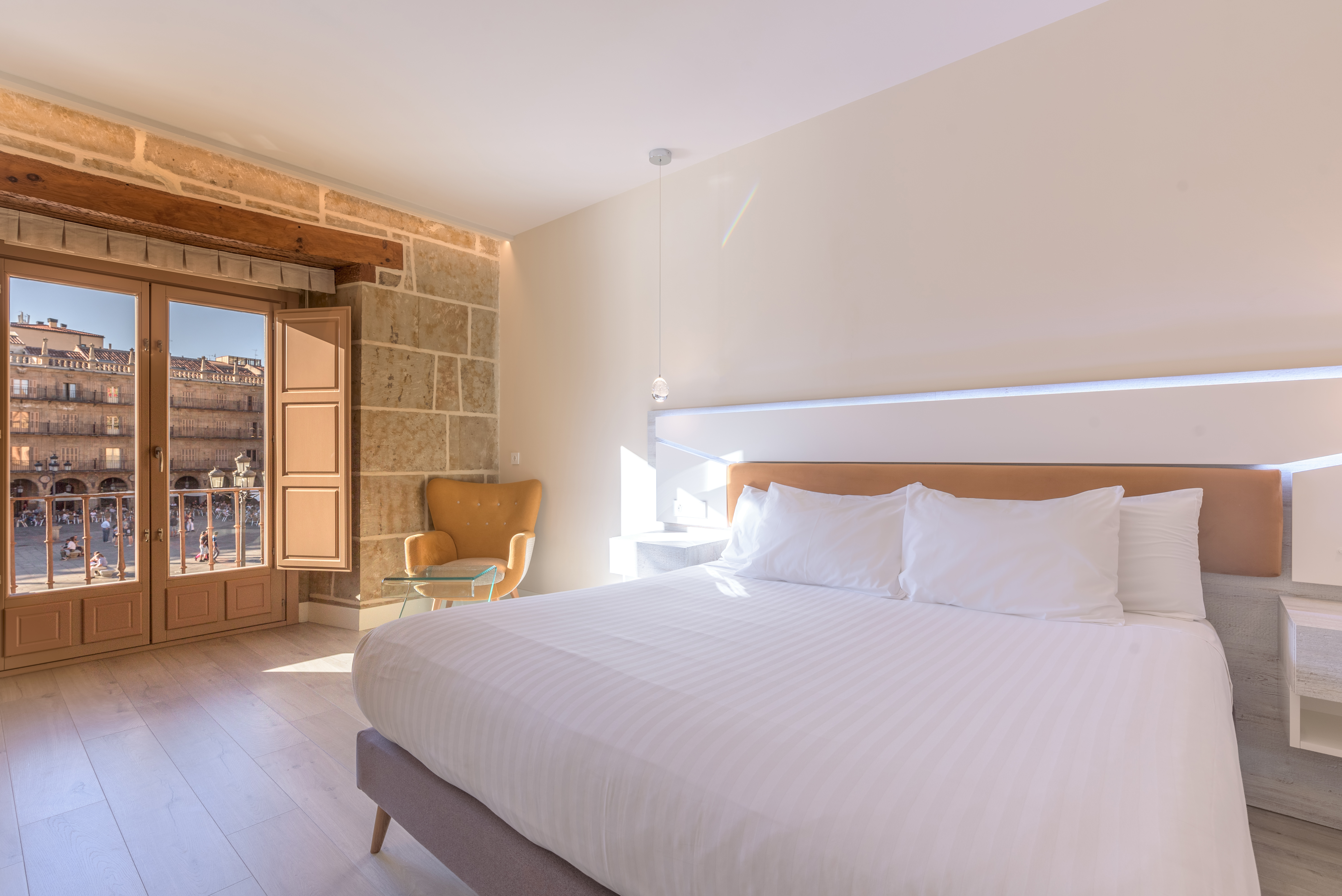 Esta habitación doble con vistas a Plaza Mayor de Salamanca dispone de aire acondicionado (según temporada), calefacción (según temporada), paredes insonorizadas, balcón con vistas y baño privado con ducha a ras de suelo y secador de pelo.